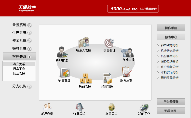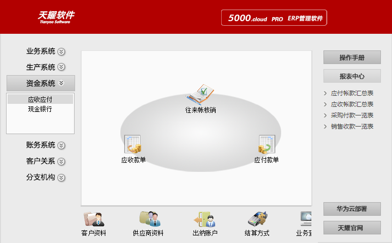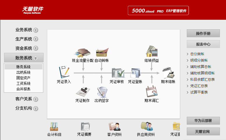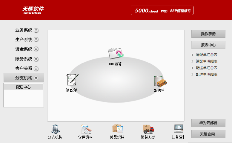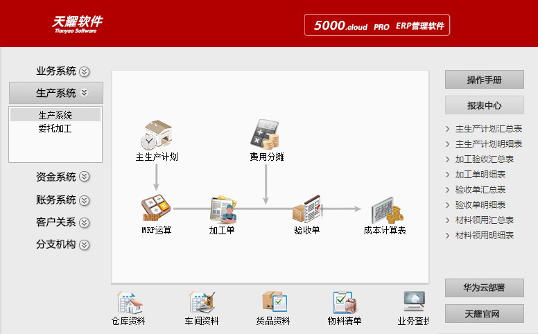《天耀5000.cloud》作为ERP管理软件,特别适合中型企业使用。软件支持云部署和桌面服务器部署及APP部署, 高度满足企业应用需求,大大提升了应用效率和安全性。软件全面实现供应链业务管理、生产管理、资金管理、财务 管理、客户关系管理、异地分销、远程配送、多机构集团化管理。支持局域网/互联网多用户应用,实现异地多机构、 多店面、多仓库等远程应用,同时支持APP移动终端应用,数据实时同步,安全、稳定、高效。