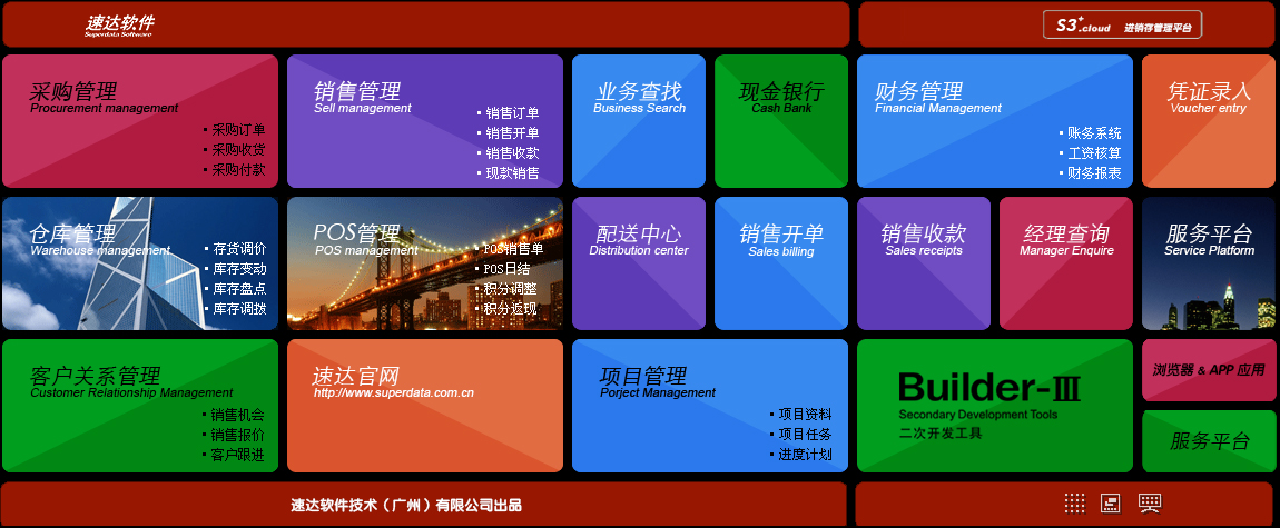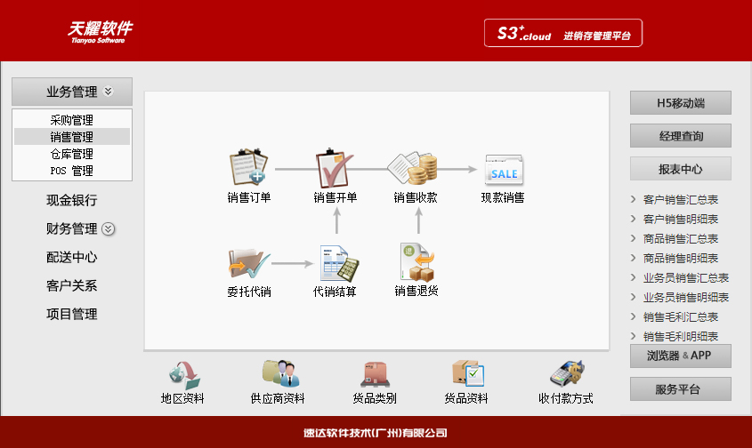 《天耀S3+.cloud》是速达软件公司最新推出的平台化企业管理应用系统。支持云部署和桌面服务器部署及APP部署,高度满足企业应用平台化的需求,实现了跨平台部署应用,大大提升了应用效率和安全性。平台化产品融入了企业经营管理和办公管理思想,提高了企业运营质量,系统有效的将庞大的进销存业务管理和OA企业办公同置于《天耀S3+.cloud》平台。同时平台支持浏览器端(B/S)、桌面端(C/S)、移动应用(APP)等多种应用模式,真 正满足企业管理和OA办公的个性化需求,全面提升企业综合能力。