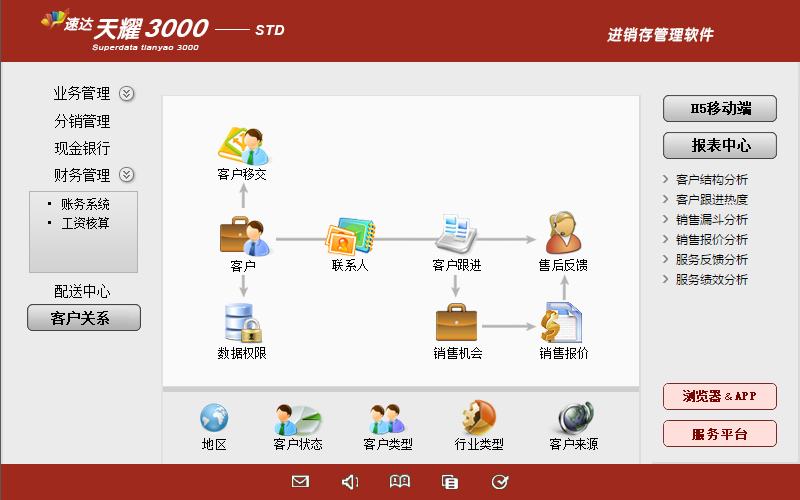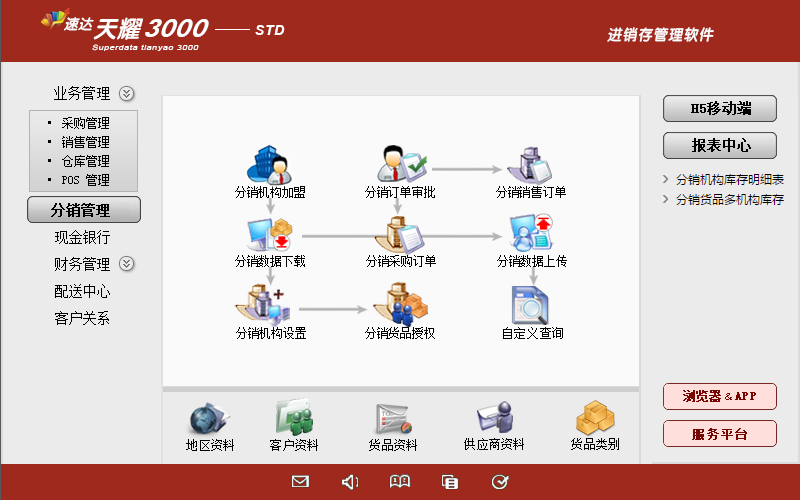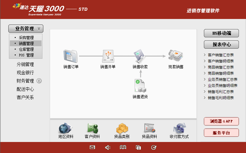 《天耀3000-STD》集进销存、POS、财务、CRM为一体的中小企业管理软件。软件采用导航式界面,易学易用、功能强大,是帮助中小企业规范经营管理、财务管理的有效工具。软件支持局域网/互联网多用户应用,实现异地多机构、多店面、多仓库等远程应用,支持APP移动端应用,数据实时同步,安全、稳定、高效、易维护,特别适合中小企业使用。
