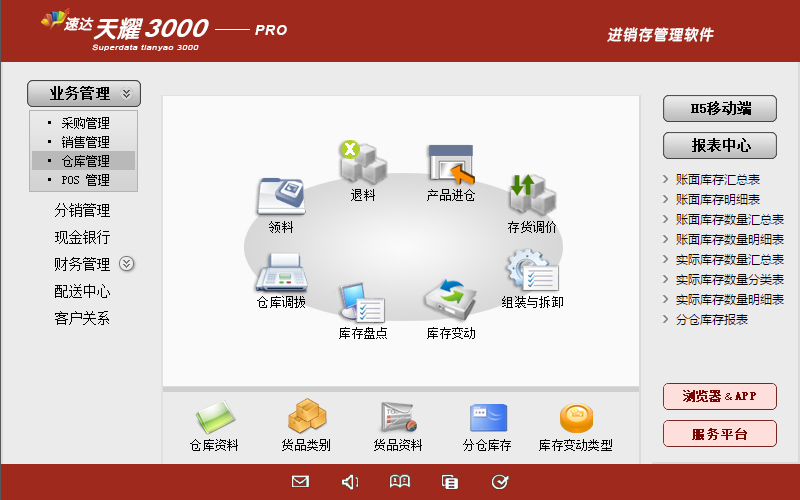 - 仓库管理:库存盘点、调拨、库存变动、分析报表、分析报表、领料单、退料单、产品进仓单、组装拆卸。