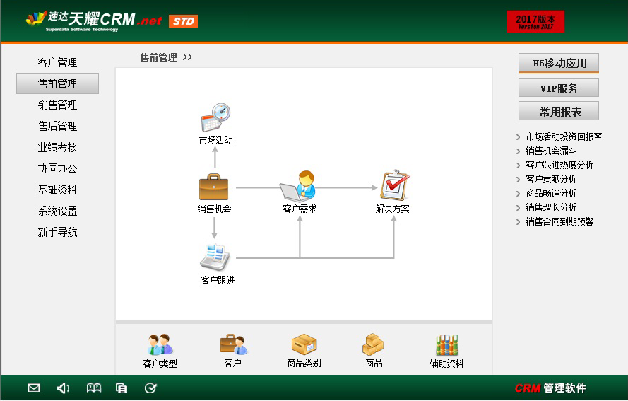 《天耀CRM.net-STD》是基于C/S & B/S & APP主流软件架构设计而成的客户关系管理系统,产品以客户为中心,基于对客户售前、售中、售后的需求优化,并关联采购、销售、财务、仓库等信息。根据客户管理原则对销售、采购业务进行完整闭环管理,堪称卓越应用。支持个性化自定义、实现个性化单据设计和打印设计、并实现对速达软件产品数据穿透、信息汇总。