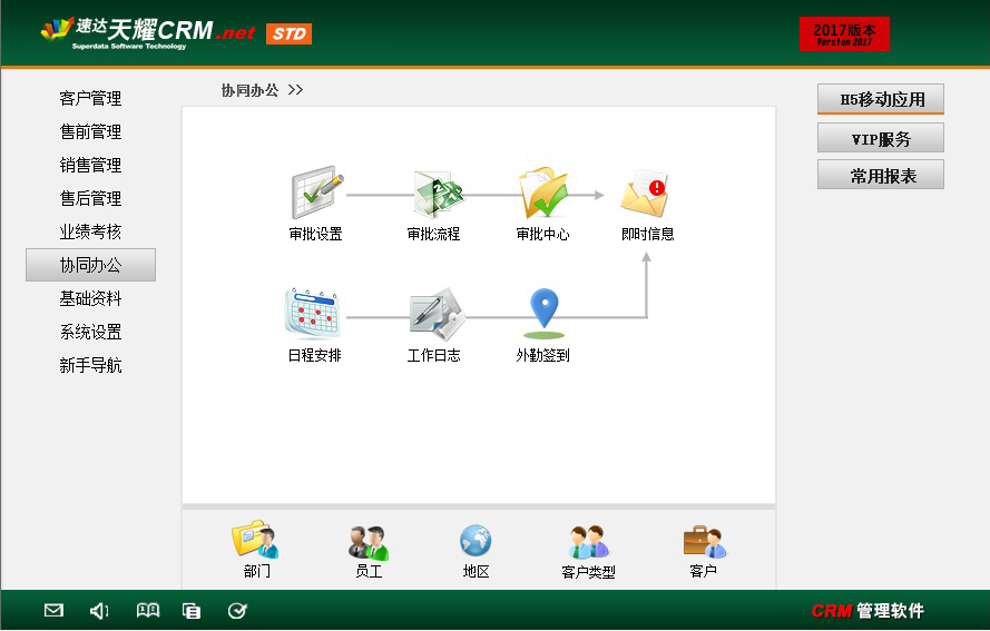 - 审批设置、审批流程、审批中心、日程安排、工作日志、外勤签到、即时信息