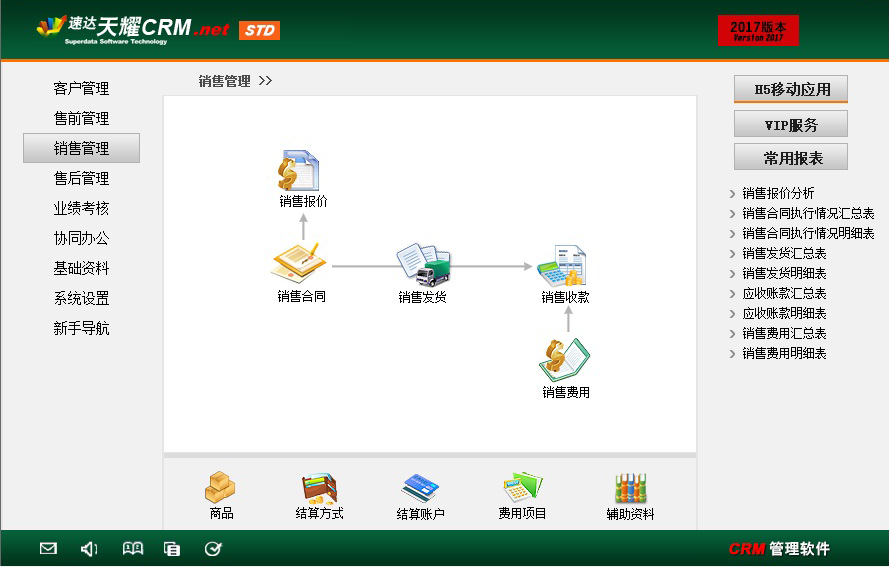- 销售报价、销售合同、销售发货、销售收款、销售费用