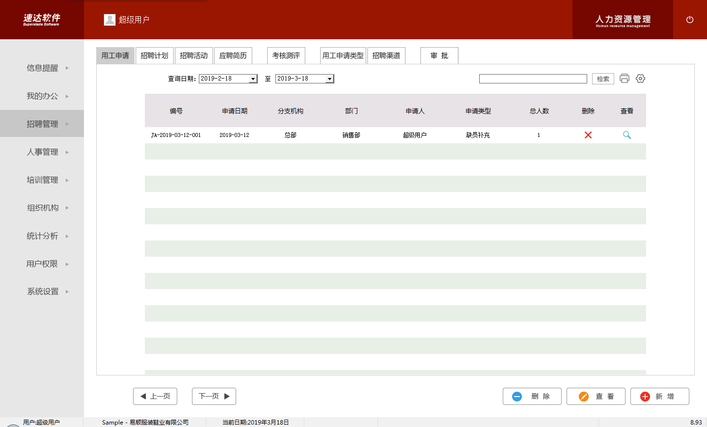 用工申请、招聘计划、招聘活动、应聘简历、考核测评、用工申请类型、招聘渠道 |