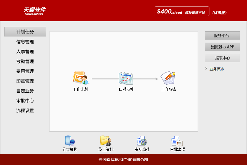 部门、职位、员工、权限、地区、客户、商品、费用项目、审批流程、企业信息、全局账号管理 |