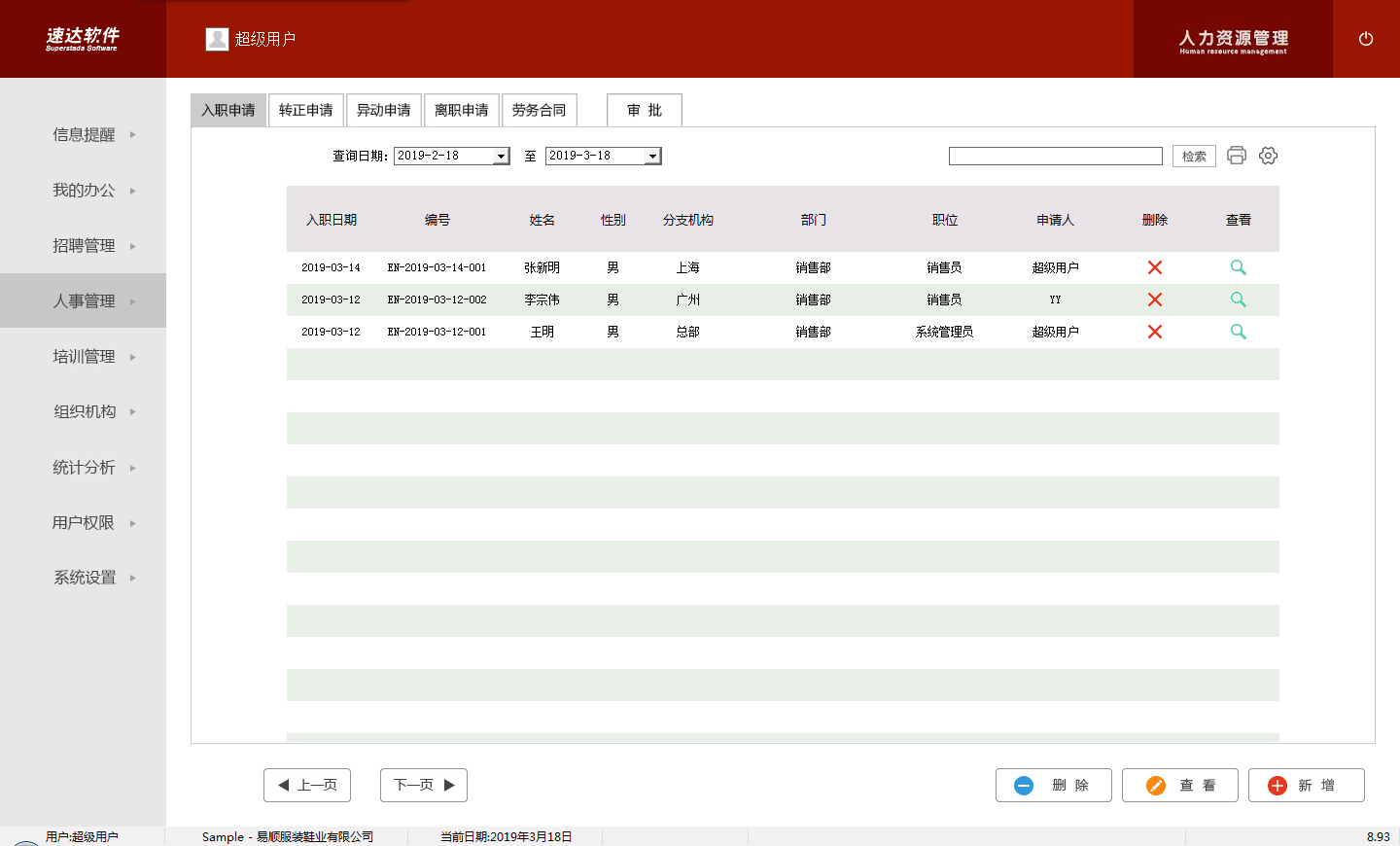 入职申请、转正申请、异动申请、离职申请、劳动合同 |