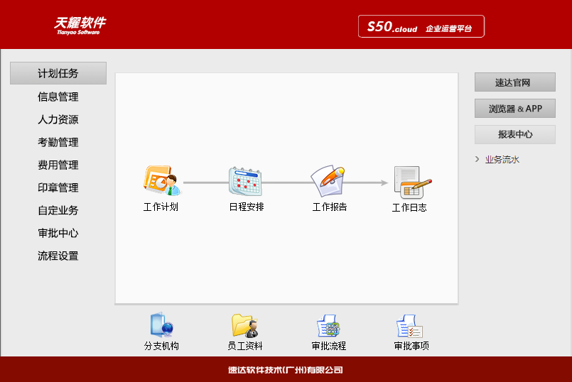 部门、职位、员工、权限、地区、客户、商品、审批流程、企业信息、全局账号管理 |